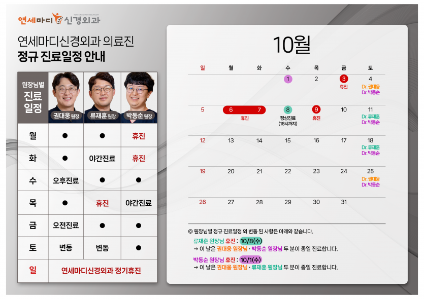 10월 원장님별 진료일정 안내 - 대구현풍 연세마디신경외과 의사일정