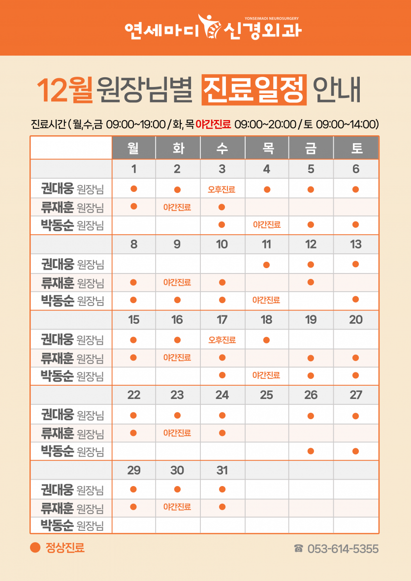 12월 원장님별 진료일정 안내 - 대구현풍 연세마디신경외과 의사일정