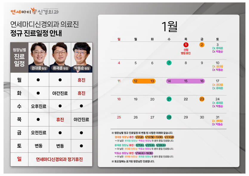 [1월 원장님별 진료일정 안내 - 대구현풍 연세마디신경외과의원 의사일정]