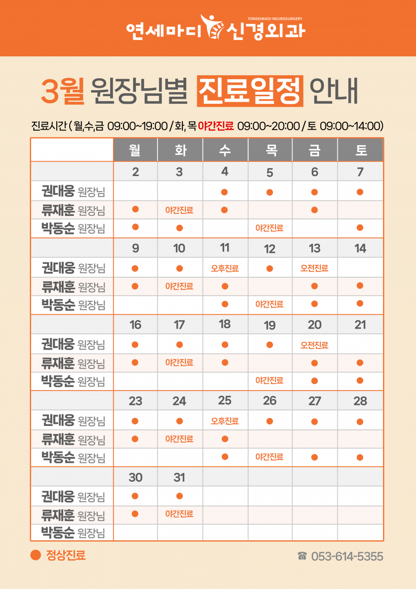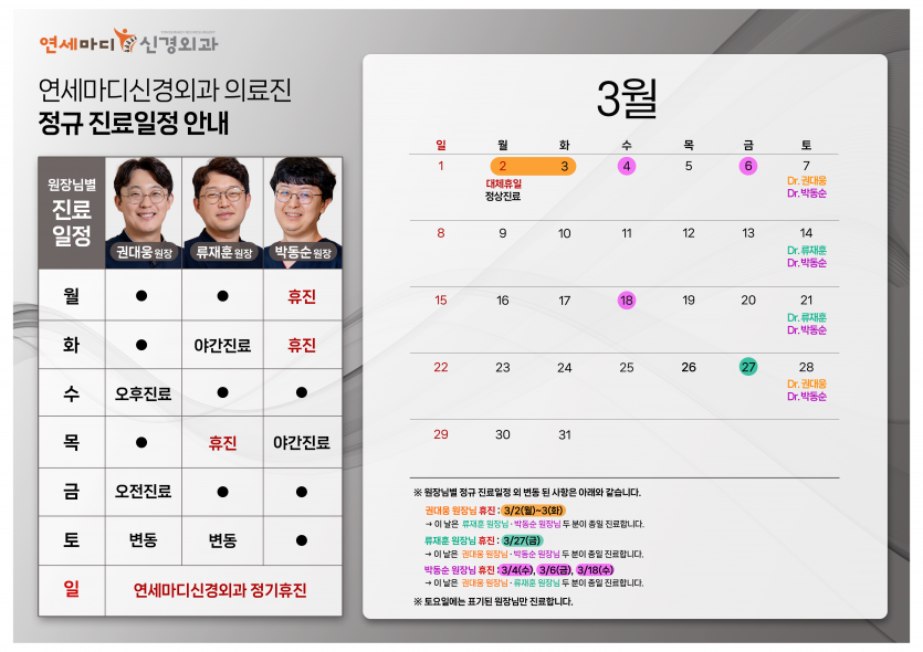 3월 원장님별 진료일정 안내 - 대구현풍 연세마디신경외과 의사일정 진료시간표